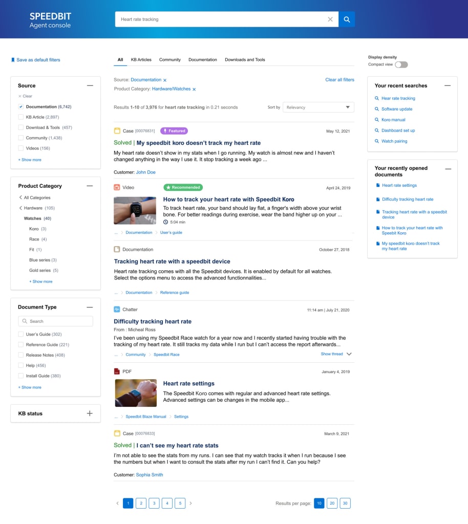 Coveo’s new Personalized Agent Full Search page provides a powerful full search experience that vastly reduces the time that agents waste drilling down, searching, or switching windows. Many agents support only certain customer tiers (business vs. consumer, for example) or a subset of products and features. In many cases, Coveo already knows the content they need to best serve a customer. Now agents can work in a full search page personalized to their own recent searches and documents so they can build proficiency and answer customer questions faster.