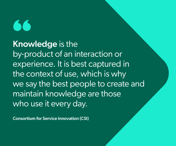 CSI states, “Knowledge is the by-product of an interaction or experience. It is best captured in the context of use, which is why we say the best people to create and maintain knowledge are those who use it every day.”