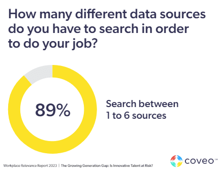 In Coveo’s 2023 Workplace Relevance Report nearly 90% of knowledge workers surveyed said they’re upset when they can’t find the correct information. This same percentage of respondents indicated they regularly search between 1-6 data sources for the right answers.