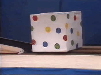 We now repeat the experiment, with a twist. We raise the yellow screen and show the colorful cube in the middle of the track. When the screen goes down, we trick the kid by secretly moving the cube behind the track and let the cart slide down. As far as the kid knows, the cart passed through the cube this time!