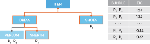 Not surprisingly, the EIG formal criteria matches our intuition: <P1, P2> is a fairly not an interesting experiment to run for the machine, as any click won’t falsify any hypothesis (<P1, P2> is the equivalent of the non-informative experiment HHHH in our coin example); on the other hand, <P4, P3> is a highly informative bundle, as the selected products cover a wide portion of the KG: a User click on P4 will be, for example, very telling about which hypothesis is likely to be true.
