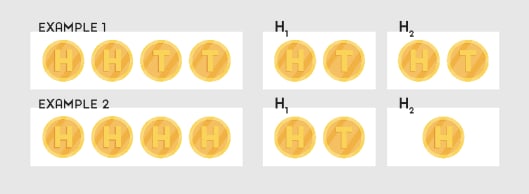 The space of possible experiments I can run to distinguish between H1 and H2 is obviously all the possible sequences of H and T in a four-item sequence. Let’s analyze two extreme cases, shown in the figure below, to make our point.