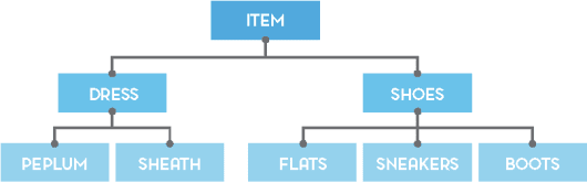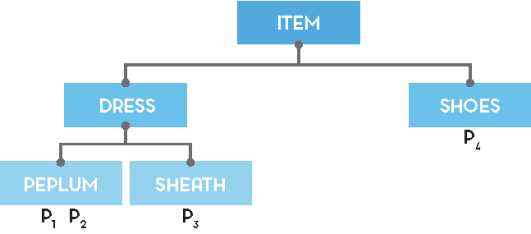 A simple KG for fashion clothes: items are either dresses or pairs of shoes, which in turn are divided into more specific types (e.g. flats vs. boots).