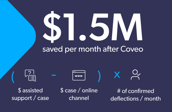 (Cost of a case through assisted support – Cost of a case through your online channel) X Number of confirmed deflections per time period = S $1,500,000 per month.