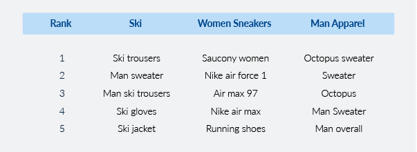The following table uses a sports apparel catalog to compare an industry-standard popularity suggestion model (i.e. a model suggesting the same query to every shopper) to a personalized suggestion model (i.e. a model suggesting a query based on the current products in the session – first column):