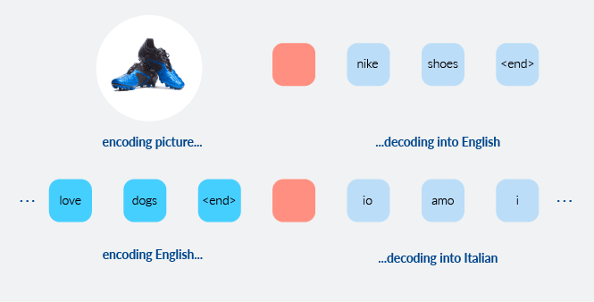 The “trick” is the encoder-decoder architecture, in which we encode the starting representation (input) in one conceptual space (English sentences into an “English space”, pictures into a “visual space”), and then we learn how to reproduce the target representation (output) in the second conceptual space (English captions, Italian words).