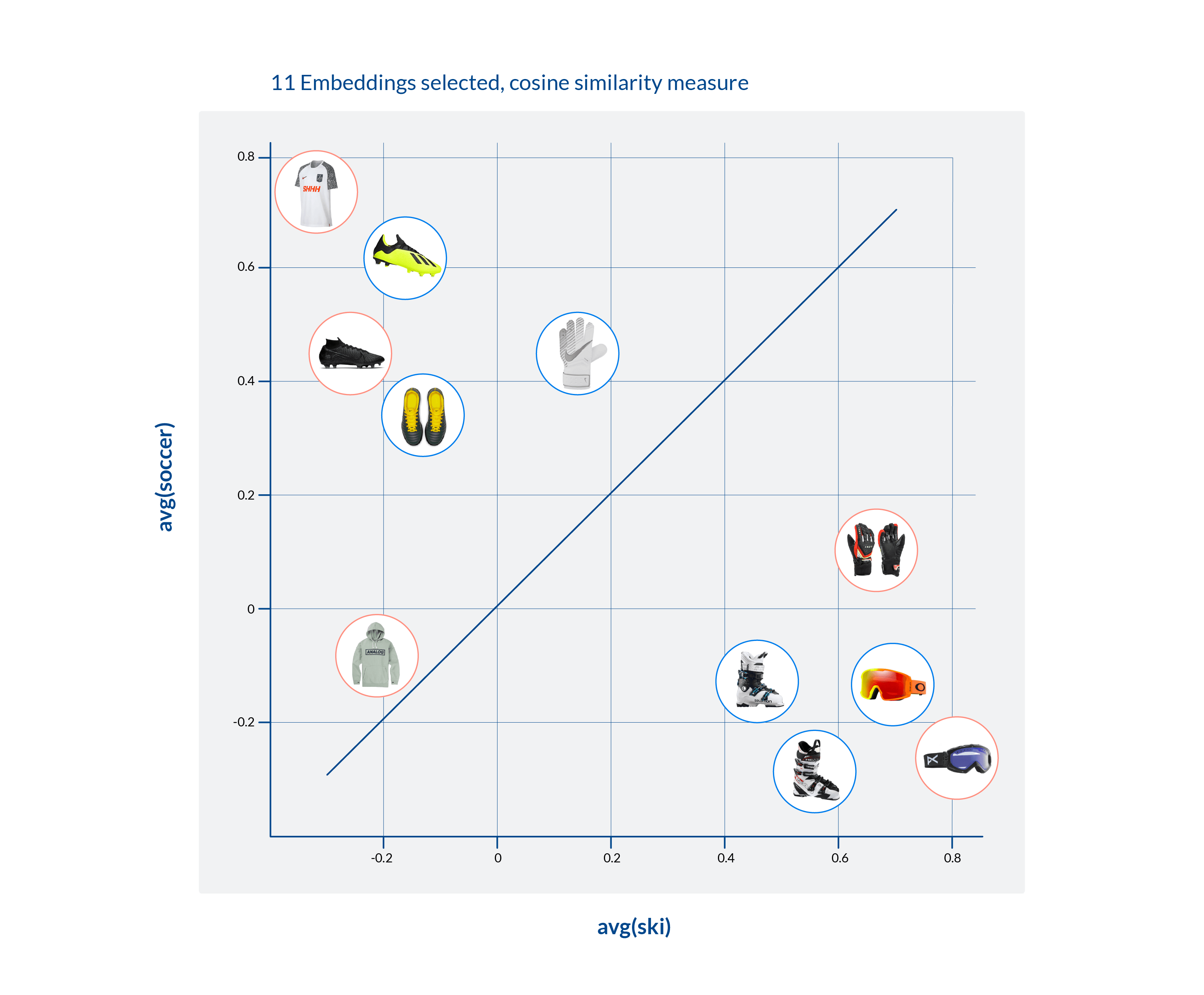 As expected, skiing-related products from both shops are way closer to the ski axis, i.e. larger cosine similarity with respect to the average ski category; and vice versa. Also, a product that cannot be classified as specifically being skiing or soccer-related (e.g. the hoodie at the bottom-left) is found to be far away from both axes.