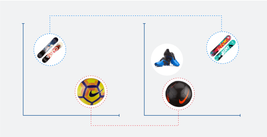 As expected, skiing-related products from both shops are way closer to the ski axis, i.e. larger cosine similarity with respect to the average ski category; and vice versa. Also, a product that cannot be classified as specifically being skiing or soccer-related (e.g. the hoodie at the bottom-left) is found to be far away from both axes.