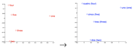 While this may seem to be the result of astonishing engineering, this ability may look somewhat less surprising when you carefully inspect what happens when you use a standard embedding technique to represent words in different languages as points in a space: