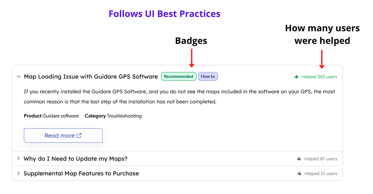 One participant stated, “I like this set up better [i.e., the design featuring UI best practices]. It has more information. It has ‘Recommended’, it has ‘How to’ [i.e., the badges]. In a way, it is much more descriptive. It even has that it helped 203 people… It’s just easier to look at, and you can just quickly go and see, “Oh, it’s recommended! Okay, I’m not going to even read anything else.”