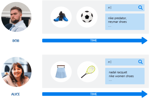 For example, if the customer searches for “shorts” after putting her selected shoes in the cart, the suggested results will be very different depending on whether she chose women’s running shoes or girls’ basketball shoes. Again, all of this is based simply on the user’s activities within one session on the website. She doesn’t need to have a past history of visiting the site in order to quickly receive personalized recommendations.