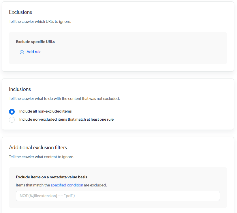 We designed Coveo’s connectors with indexing flexibility at their core, to help enterprises avoid boiling the ocean. Their advanced filtering options allow organizations to define and refine what data is indexed. Filtering out “garbage” at crawling time helps with indexing speed, content freshness, and relevancy.