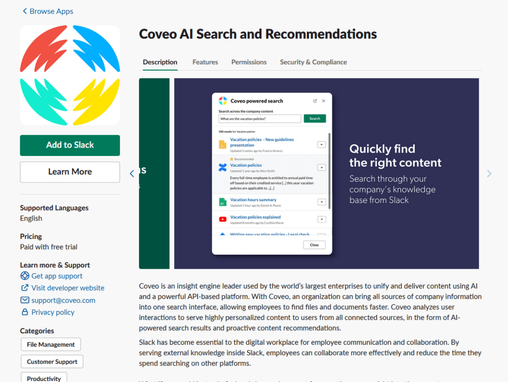 That’s right, turn Slack into your intranet platform with the Coveo AI Search and Recommendations.