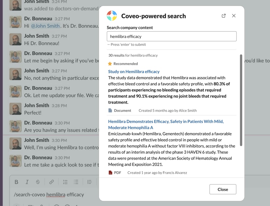 - Once selected and confirmed, you’re ready to roll! The ‘/search-coveo’ command is now your access to all your company indexed content, all within Slack!