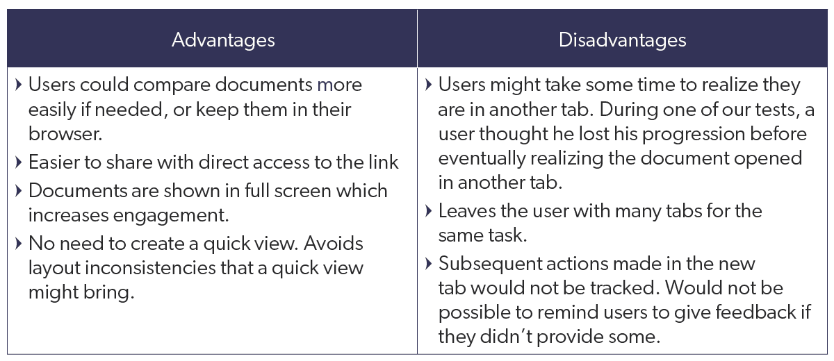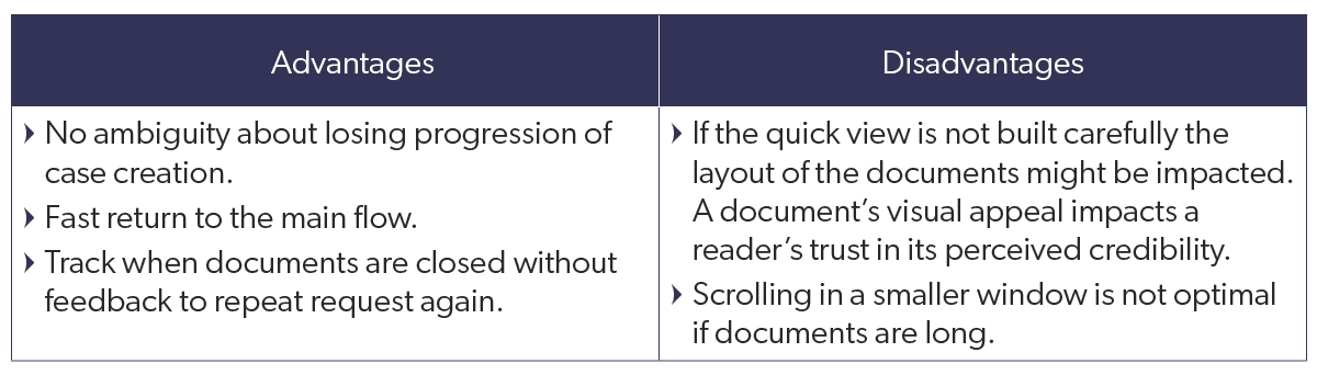 Now that you know how to display the documents in the form, how should they open? We suggest two options: in a new tab or in a quick view option. Here’s a list of pros and cons to help you decide.