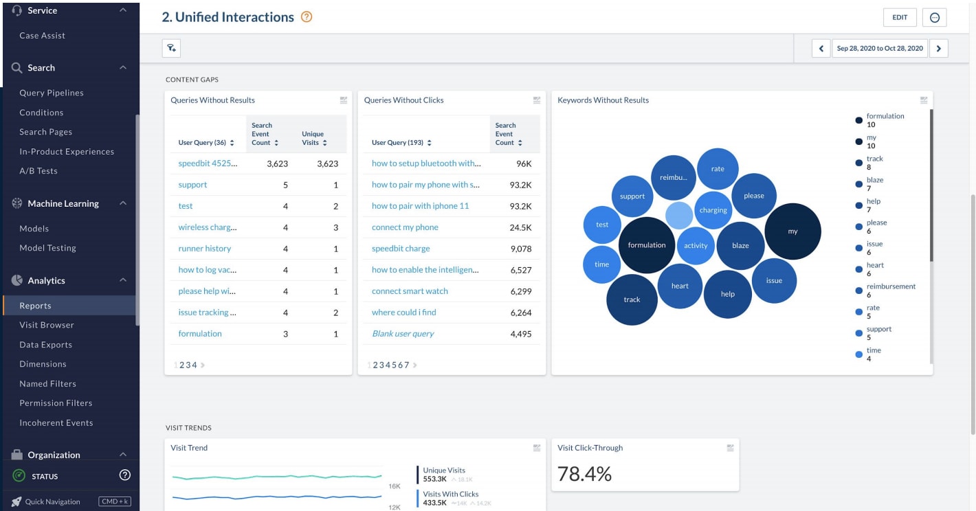 A content manager, for example, might be interested to know which high-volume keywords don’t return any results. A service manager or contact center director might want to monitor how many cases were submitted or deflected in the past month, as well as the dollar value associated with each.