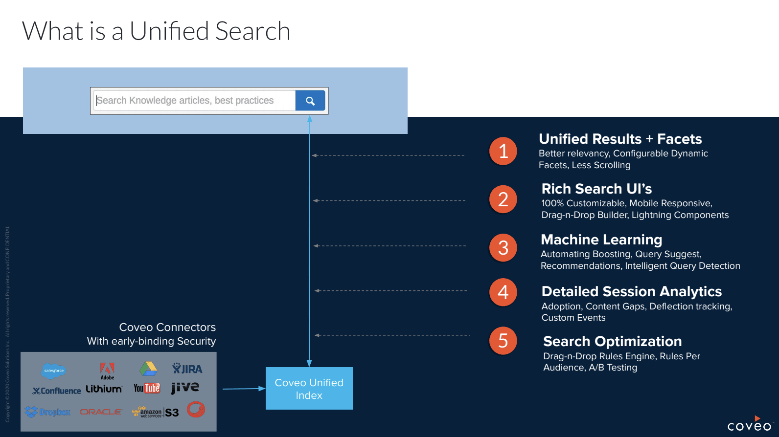 - Present unified search results in a single setting that is actually indexing multiple content databases and sources (YouTube, Google Drive, and Salesforce, for three common examples).