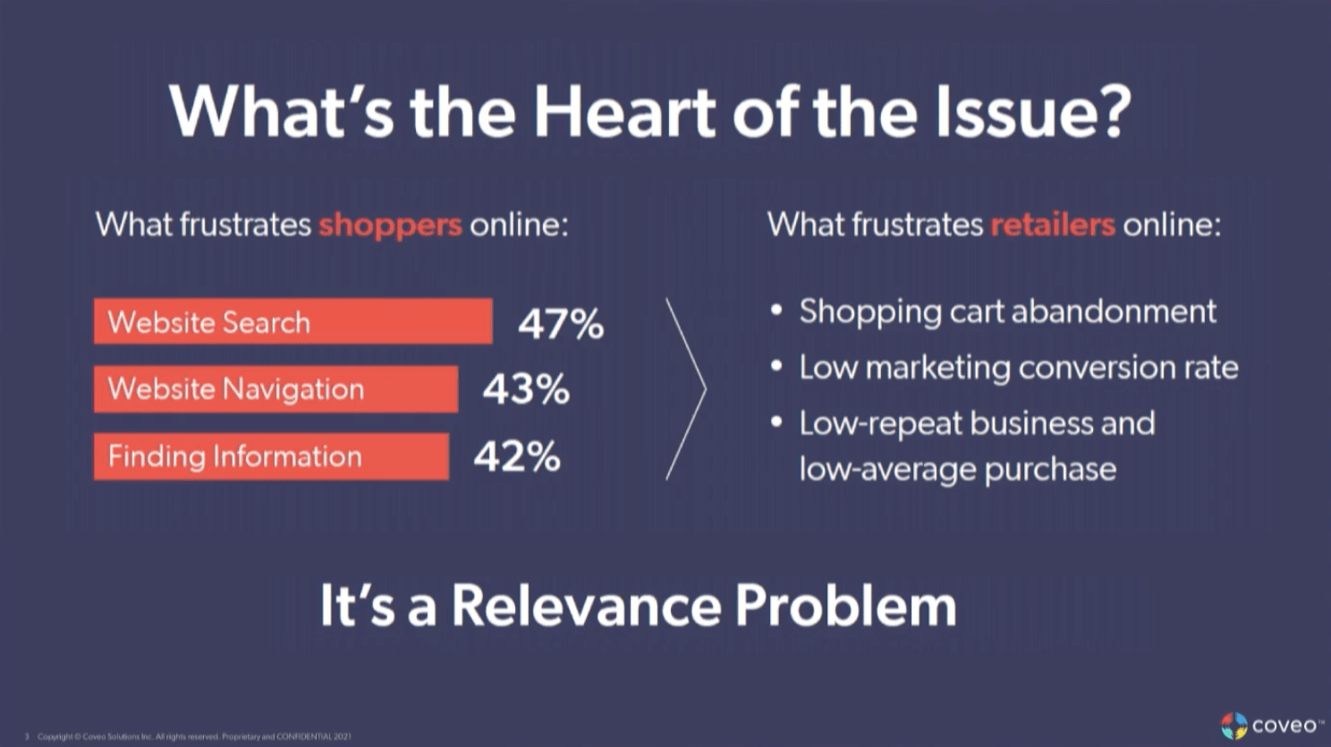 What’s behind shoppers’ disappointment? The Coveo survey found a clear theme in the problems they experience while shopping online: a lack of relevance. In other words, on too many websites, consumers just can’t find what they need, when they need it. These sites haven’t found a way to replicate the customized guidance and advice a knowledgeable sales associate can provide at a brick-and-mortar store. With 90% of consumers expecting that online shopping be as good as or better than in-store buying, that relevance gap is a big problem.