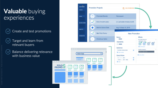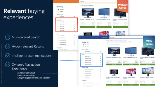 - Intent detection: Automatic relevance tuning uses past behavior to predict which products and content will be most useful for each buyer.