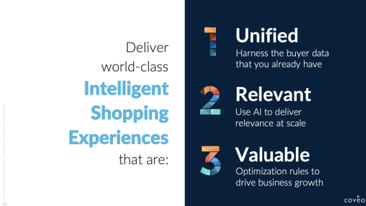 Effectively, the Coveo EIP brings together all the leading-edge technological capabilities you need to deliver on each of the core components of an intelligence shopping experience. From intelligent commerce search to usage analytics, it has everything you need to put the theory of delivering intelligent experiences into practice through the use of data and AI.