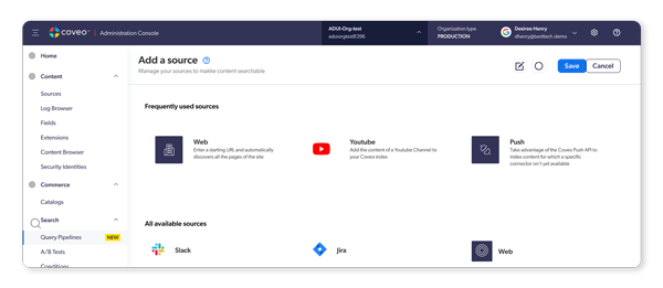 To make this easy Coveo provides around 28 connectors that crawl through different types of databases and data sources. This can be as easy as providing a Youtube channel URL. For more complex data sources, developers can use the Push API which allows them to drop data in JSON document format from any data source.