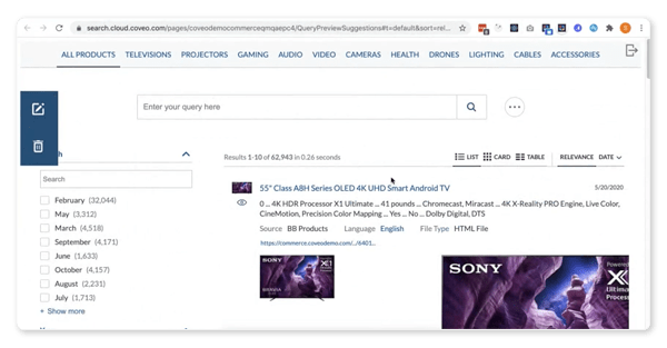 Different items have different characteristics and so users filter on them with other types of facets. For instance, if a user searches on “monitor” they might want to search on size or interface type (i.e. USB-C, Thunderbolt, HDMI, VGA). If that same user searches on “laptop” then size and processor speed might be more important. Rather than requiring painstaking ordering by product marketers or data analysts, Coveo’s machine learning model is able to figure out what filters are most popular or relevant to what customers are searching on.