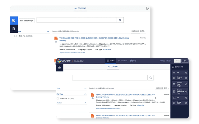 While the Interface editor creates a basic interface initially, by using the drag and drop interface, Coveo users can create full-featured search UIs without writing any code.
