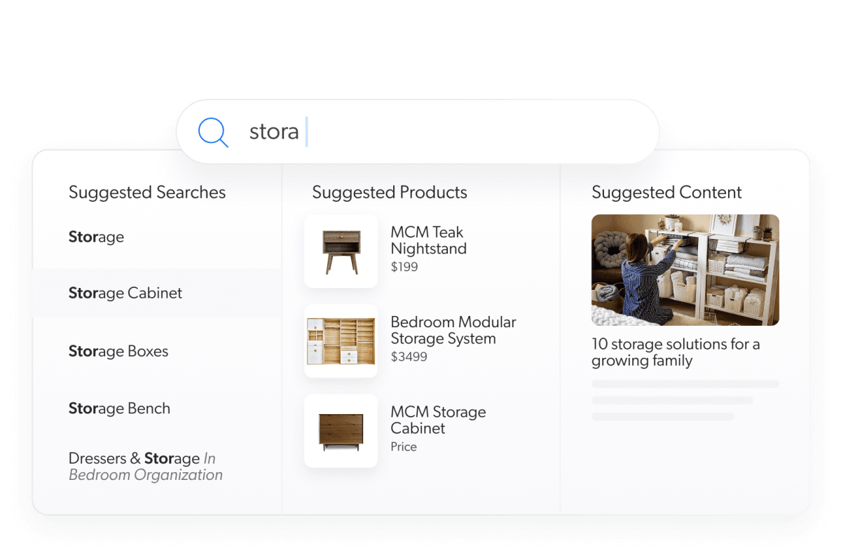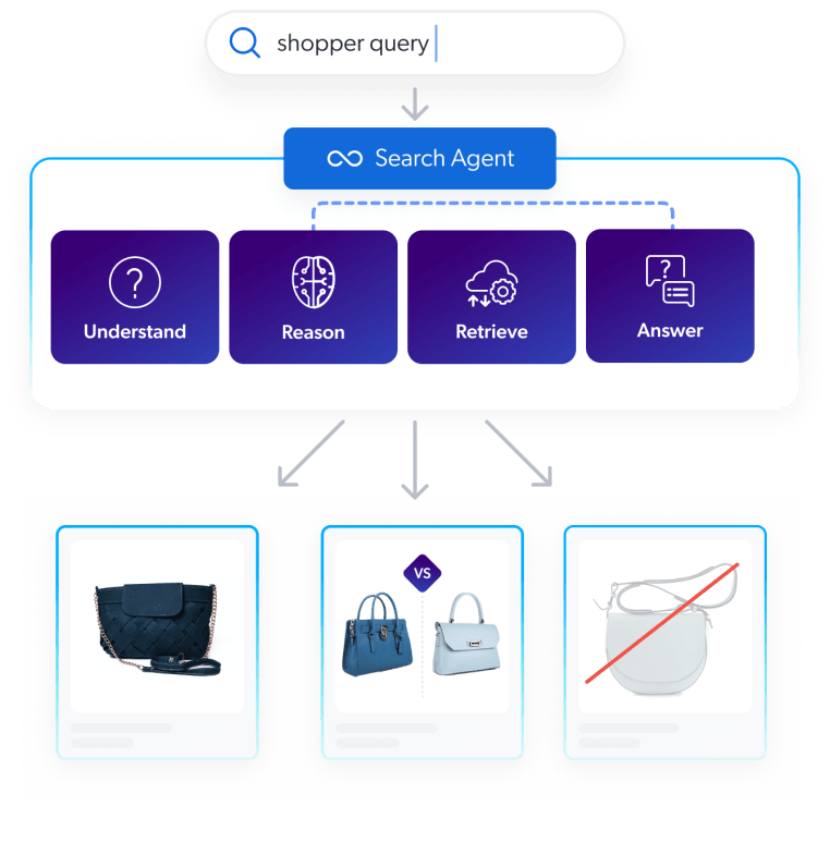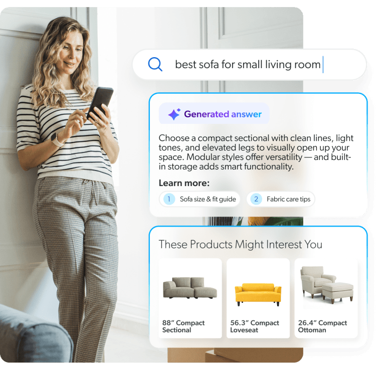 Bei der Produktsuche geht es darum, etwas Bestimmtes zu finden. Käufer geben eine Suchanfrage wie „Laufschuhe“ oder „schwarze Anzughose“ in ein Suchfeld ein und erwarten schnelle und genaue Ergebnisse. Bei der herkömmlichen Suche geht es darum, das abzurufen, wonach explizit gefragt wurde, idealerweise mit Unterstützung für Tippfehler, Synonyme und Filter.