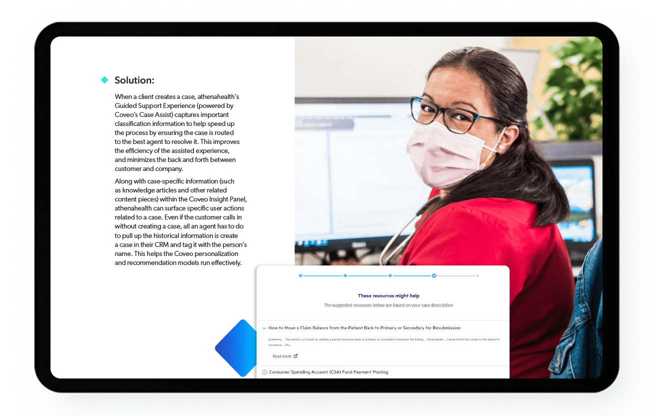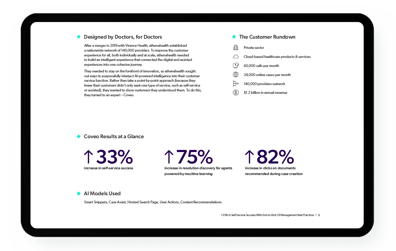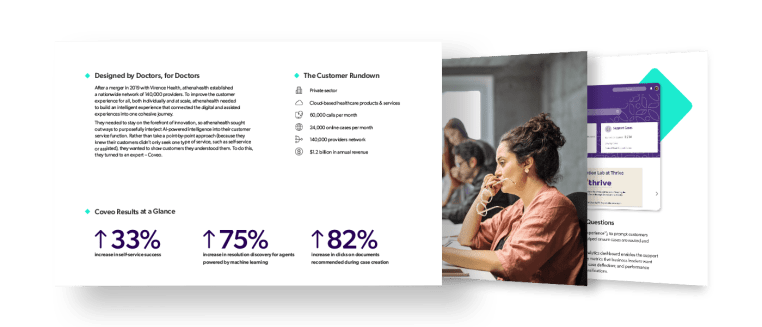 athenahealth’s transition to a unified knowledge base integrated the wisdom found in seven siloed systems, including Microsoft SharePoint and their own homegrown platform, into one. This empowered agents to do a single, manual search for the resources most likely to address their needs. Now athenahealth is experiencing an over 75% increase in resolution discovery.