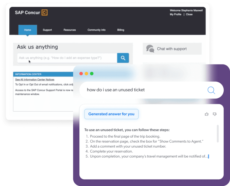 Durch die Nutzung einer einzigen KI-Such- und Empfehlungsplattform zur Bereitstellung leistungsstarker digitaler Erlebnisse kann SAP Concur das enorme Wissen erschließen, das im gesamten Unternehmen vorhanden ist.