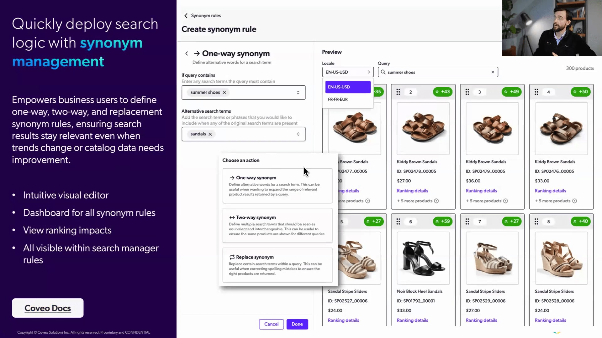 Hello, everyone. Good morning and good afternoon to those of you joining us from Europe today. So this is the new Incoveo for Commerce fall release session. My name is Shareen Reed. I work on the product marketing team here at Coveo, and I'm joined by my colleagues, Simon Lange and Benoit Sibaut. Hello, everyone. And they will be the ones that will be walking you through some of the newest functionality for commerce today. First, before we get started, before we get to the agenda, Simon, I have a couple of, housekeeping items to cover quickly. So everyone is in listen only mode as you might imagine. However, we wanna make sure that we answer any questions you may have, and so you can submit those by accessing the q and a chat feature on your screen. And we do have a few minutes reserved at the end of the presentation to answer any of the questions that might have come in. Today's webinar, I'm gonna highlight this because it's always a question that comes in. It is being recorded, and you will receive the recording and related materials about twenty four hours or so after the conclusion of the event. Now we're going to just quickly talk about the agenda for the session today. So first, we're gonna cover, of course, the latest and greatest in AI, machine learning, followed by, updates on our Gen AI solution, relevance, generative answering. Then we're gonna move into our merchandising hub. And a reminder for those that are not aware, the inspiration behind the merchandising hub is really to make every, decision and action easier to execute for merchandisers. So that's our focus. A bunch of new functionalities being released for our merch hub with that in mind. So including, updates to the search manager, recommendations manager, plus the ability to very quickly and efficiently create listing pages. Also some exciting new fun functionality around ranking transparency. So if you've ever wondered why, products are ending up on the first page of your search results or maybe why they're not, well, now getting those types of the insights and details is gonna be really, really easy. Just a couple of clicks on the product card. So Ben's going to demonstrate that to you later. And then we're going to finish off with some updates on certifications. So with the agenda being covered, I just wanted to kind of set the context a bit before handing over to Simon. And I wanted to find out a couple of interesting stats from our most recent commerce industry report. So we do this report every year. We've been doing it for a few years now, and we, survey over four thousand consumers to get an understanding more about, you know, shopper buying habits and where they're going and and what people are thinking. So I pulled three quick stats here that I want to share with you. And the the first one, of course, is no surprise, and we see this consistently year over year. Sometimes, you know, it's ninety percent, sometimes it's ninety two. This year, it's ninety one percent, and people expect so ninety one percent of people expect their online experience to match or surpass their in person experience. So definitely a high bar in terms of expectations. So that one's not so much of a surprise. The interesting one, though, is the middle one. So what we found is that ninety four percent of people either start or end their purchase journey online. And when you pause to just think about that, about your own behavior, it kinda makes sense. So we often consult online before we go into, a store. We research or we're maybe we're inspired by something we've seen on social media and then vice versa. Right? We browse in store and then go online or maybe we to comparative shop or maybe we even use our mobile while we're in the store. I know I do all the time. And then we might head home, complete the purchase. So even though it might be difficult to track these kinds of, you know, physical digital conversions, They're definitely happening. And so optimizing your product discovery on your site is both strategic and critical for your overall business, not just your online business. And there's third stat here I wanted to share, which is a new question we've added on the survey this year, which is about Gen AI. Right? So there's been a lot of buzz, a lot of hype around, you know, ChatGPT, Gen AI. And we wanted to ask people, did they really think that there would be a potential impact on the way they shop today? And very surprising, seventy two percent. So almost three quarters of people responded that they expect their shopping experiences to change or evolve in a number of ways due to Gen AI. So it could be, you know, that some of the answers that came back were anything from, you know, having a virtual shopping assistant to guide them or maybe having GenAI help them troubleshoot with issues on the products. But the strongest response was really related to shoppers getting help to to really educate them on products and, like, the their different attributes before they start, shopping for a specific product. And that was almost half of that seventy two percent. So we were actually happy to see that because, really, that's where Coveo is investing, and we'll cover a little bit of that later. So with that as a backdrop, I'm just gonna pass it over to Simon, and, we'll get diving into our, functionalities, new functionalities and road map. Thank you, Shereen. And, indeed, we will go back to that idea of, education using GenAI. It will be a big part of what we have on the road map. But before just, driving back a little bit to, into AI and mostly AI powered relevance, and, you know, before I start talking about the, the different feature, just wanna show again, what are the, I would say, the the stacking element of, AI powered relevance. So at first, you know, a standard search at a a search solution, you will expect him to be able to do filtering and boosting rules, obviously. So to be able to tell, what is the order of the different p