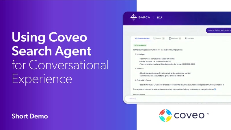 Today’s customers expect answers — not journeys. But most support experiences are still stuck in “search and scroll” mode. This live demo walks through a fictional enterprise, Barca, showing how Coveo’s AI Search Agent transforms that journey into a personalized, efficient conversation that deflects cases, surfaces trustworthy answers, and knows when to escalate to a human.