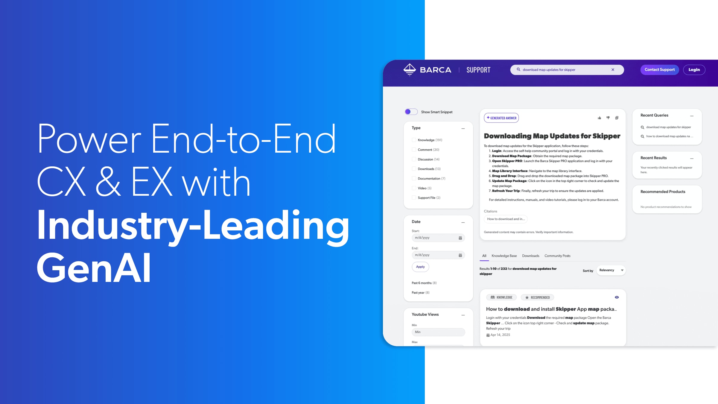 In this brief video, we'll demonstrate the powerful search capabilities of Coveo for website search. Coveo offers advanced search recommendations and generative answering across multiple use cases, with websites being the use case we explore today. With Caveo, you can create a unified index that unifies access to content from various sources across and beyond your content management systems, including support portals, discussion boards, and even internal intranet. Today, we'll showcase key Coveo features using a demo website for Barca, a fictional boating company. Barca uses Coveo across multiple applications, including their corporate intranet, customer support portal, various commerce sites, and their main corporate website. For this demo, we'll focus on the corporate website. This site houses a range of content, including marketing materials, event listings, blog posts, product documentation, FAQs, and team member information. With Coveo, content location isn't a barrier. You can ensure that visitors quickly find what they need. On the search page, you'll see filters or facets on the left side to narrow or broaden search results. These facets can be drawn from standard or custom metadata and are normalized across the various content sources used. You'll also notice tabs or links at the top, providing another way for users to refine their search. Result templates are customizable to ensure the layout makes sense for the content being presented. This helps users easily understand and interact with the search results. Caveo offers more than just links and titles. It provides additional context AI publication date, content type, and relevant images. You can sort results by relevance, date, alphabetically, or any other criteria that best serves your users' needs. Our goal is to help users find what they're looking for quickly and easily. The prominent search box encourages users to ask detailed questions, not just enter keywords. As I begin typing a query, Coveo's machine learning model provides spelling mistake aware query suggestions based on successful queries from other users. This ensures that users can easily find relevant results. Let's search for information about Barca's Skipper product, a global positioning system. As I type Skipper, Coveo offers highly specific suggestions, such as product versions and general GPS information. When I search for skipper GPS, Coveo quickly delivers even more highly relevant results. Notice how the facet values automatically adjust based on the returned content, helping users understand its origin. A recommended tag next to a top result indicates that Coveo's automatic relevance tuning powered by machine learning has boosted content based on user behavior, making it easier to find the most useful information, enhancing the user experience. Now let's explore a more complex query. Suppose I'm looking into Barca's Skipper GPS, but I want more information about GPS systems in general. Searching for how to use a GPS performs a semantic search, returning highly relevant results based on the user's intent, such as best practices for using GPS systems. However, with AI and large language models becoming more common, users expect more detailed answers. Coveo meets this expectation by leveraging a secure, generative large language model that returns answers to complex questions written in human language and based solely on your content. The generated answers include citations, and users can provide feedback on the quality of the answers, helping content creators improve their content over time. This capability enhances information discovery, FAQ management, and product discovery on your website. It also helps marketers get more out of their content with the ability to combine the most relevant parts of various pieces of content to generate the best answer. As mentioned earlier, Barca uses Coveo across various applications. For instance, on the events tab, the content layout differs, offering filters and search options relevant to event dates. Similarly, when searching for people, different criteria are highlighted, such as department or expertise instead of date relevance, which may not be as critical for this search. Coveo's content recommendations feature is another powerful tool to help users not only AI, but discover more of your content AI to their needs by analyzing user behavior, what they search for, what they click on. Coveo can automatically suggest related content within documents, like in the you may also be interested in section. This reduces the burden on marketing teams and enhances content discoverability. Note that we're able to take advantage of and learn from user behavior to enhance the findability of information. Caveo enables the creation of a rich, relevant search experience by leveraging AI and machine learning models. We hope this brief demo has been helpful, and we look forward to discussing how Coveo can enhance your website.