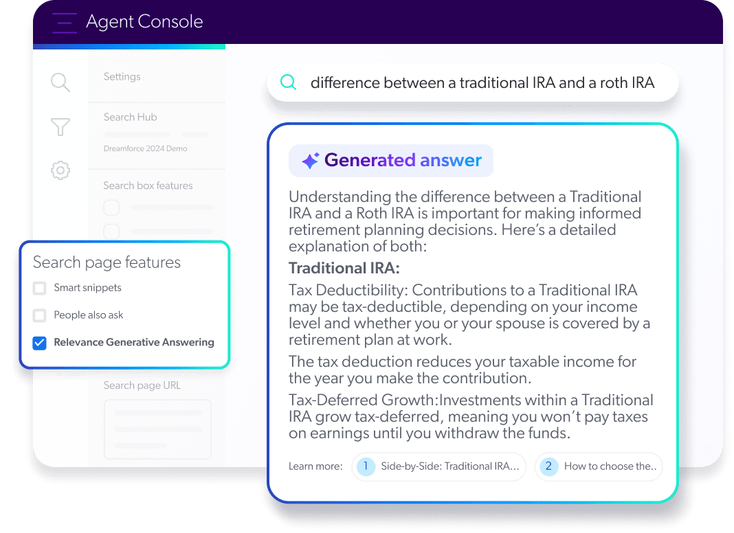 - Deliver consistent, trusted answers across customer portals, agent workspaces, intranets, eCommerce sites, and custom chat interfaces—from a single intelligent index.