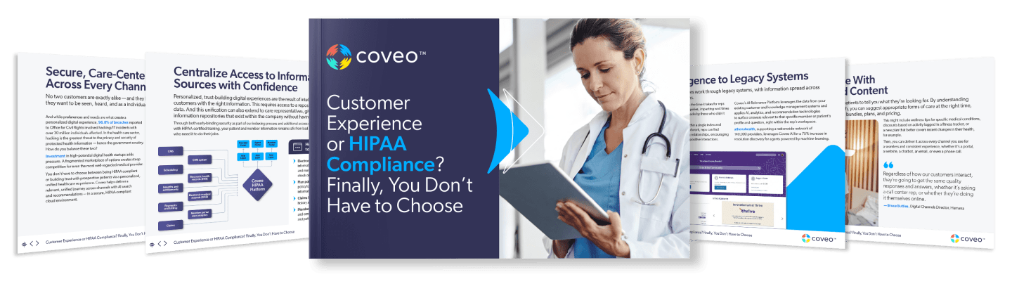 - Invest in a compliant environment that meets all needs. Coveo AI helps health providers and insurers member and patient service by providing HIPAA-compliant sites that map better health journeys through the use of safe and secure AI-powered insights.
