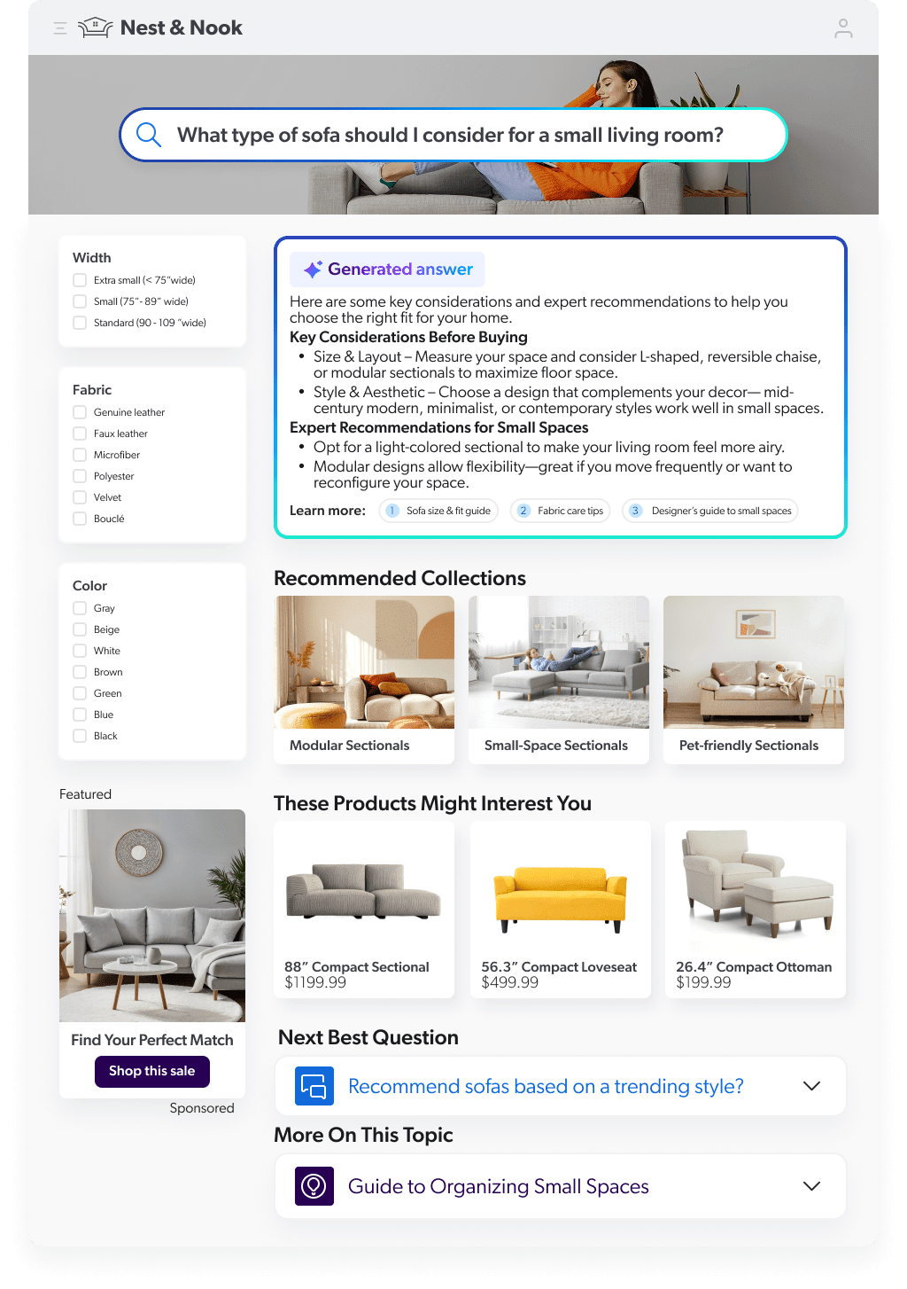 A shopper searching for what type of sofa they should be considering for a small living space doesn’t want to see random sofa listings, be redirected to a chatbot, or have to rephrase their query multiple times to get the right results. They expect search to understand their intent and deliver relevant recommendations instantly.