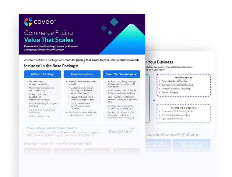 Maximize business outcomes at every touchpoint with advanced AI search and product discovery for B2B buyers and B2C shoppers. Coveo decodes search intent to deliver conversational, personalized, and relevant shopper experiences at scale. Get the details on our flexible, modular pricing to build the perfect solution for your business.