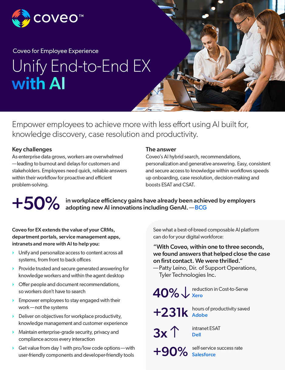 Empower employees to achieve more with AI built for knowledge discovery, case resolution and productivity. Learn how Coveo unifies the end-to-end digital workplace journey.