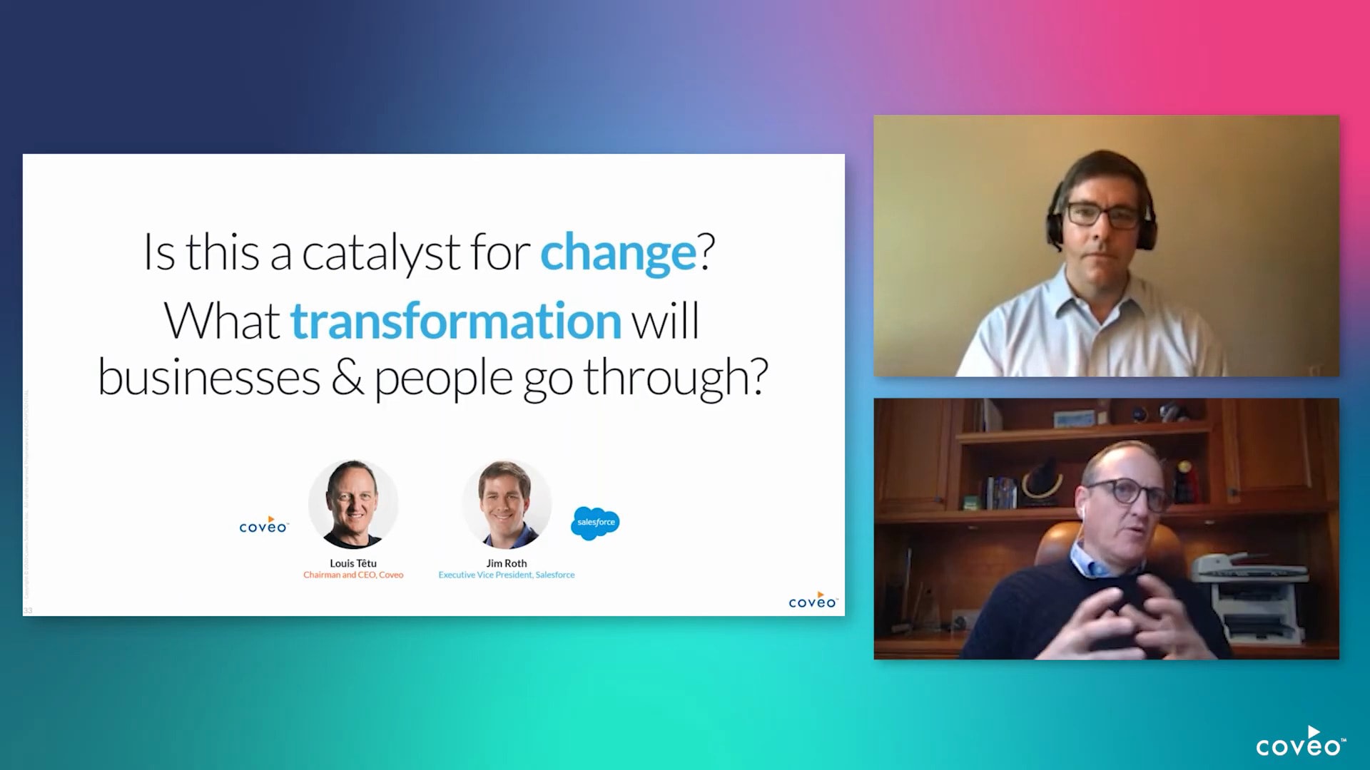 Hi, everyone. Thank you for joining our digital leadership through crisis session. I'm your host. My name is Tracy Carson. I work on the global marketing team here at Coveo, and it's a real privilege to be with you today. Today's conversation is going to feature Jim Roth, our, executive vice president of customer support at Salesforce, and our very own Louis Tetsu, chairman and CEO of Coveo. Jim is joining us from Austin, Texas. He joined Salesforce in November of twenty nineteen to lead their global support organization. He previously held senior positions at Dell, where for seventeen years, he worked in services, marketing, and IT, the real run through run through the organization there. And Louie is joining us from his home in Quebec City. As I said, he's the chairman and CEO of Coveo. And prior to Coveo, he founded Thuleo Corporation, which was acquired by Oracle in twenty twelve. A couple of housekeeping items to cover just before we get started. Everyone's in listen only mode, but we do want to hear from you. So please use the question panel in the GoTo, webinar, interface there for you. We are gonna record the session and we're gonna send it out to you after the fact, within twenty four hours. Enough for me. Louie, why don't you get us started here? Thank you very much. And, Jim, thank you for, being with us today. Start off, with, obviously, the usual, forward looking statements. So, if any of you wish to either trade or make purchasing decisions, these are made on your own and, you know, the the usual, drill here. We're gonna communicate to you some some, some opinions and, some some personal analysis of this situation. And, it's it's each and and everyone's responsibility to exercise their own judgment. With that, I would kick it off, certainly, by acknowledging the gravity of the situation, and, and the fact that, it's it's certainly amazing to all of us and everyone on the line here, how the world can change so quickly in, such an abrupt way and it's such a a short period of time. Billion and a half people are under orders to stay at home. Work and education are remote from home, and and this is obvious. We all live through that. Contact centers are overwhelmed, and and often, you know, there's more customer demand, and less agents, and agents are also working from home. Obviously, on the commerce site, site, in store commerce is halted and online is the only alternative. And, this essentially all unfolded, within about a month. And I would say, at a high level that, you know, the major transformation here is that people are on their own. People need to do more on their own. And so to us, when we look at this, there's obviously an immediate response to this, which we're gonna talk about, both Jim and I. And, but there's also a longer term response and a profound transformation. And, and I would say this is a proficiency challenge, not only an efficiency challenge. And, as a French Canadian, I will pull up Celine Dion, all by myself. This is, I believe, how a billion and a half to and and perhaps more people feel, right now. And so the question is is is how do we how do we react to that change? And, and and how do we think about that change both, short term and long term? I think it's fair to say right now that no organization wishes that they were less digital right now. Everyone, every business, obviously, must adapt to this virtualized world. And, obviously, you know, some are more prepared than others. Some were more prepared than others. And I believe this, will have an impact on how people think about that. So there's there's really a notion, obviously, of adapting, to cope immediately, and, we're gonna talk about that. But we're also gonna talk about, you know, once once, you know, that that is taken care of, you know, how does that impact, long term transformation to compete, and and what does the new future, look like? From an immediate perspective, I'm certainly happy to share and, we'll talk to Jim in a minute about how we've been dealing at at the issue here at Coveo and then with Jim at at Salesforce. You know, this this fundamentally, requires a priority framework. And and for us at Coveo, just like every organization, you know, what we did as as a leadership team is we picked up the phone, we talked to our board and our shareholders, and we we got broad agreement, from them that this would be the order of priority. In other terms that, you know, protecting shareholder shareholders assets, although a priority, would not come before protecting our employees and, and continuing to serve our customers. And, and so we've taken, obviously, the immediate measures, I think, at a high level beyond the traditional, you know, safety, and health measures that, we've taken, the way we think about this is we wanna try to protect the company as a source of security and, and stability and safety for the employees. And so this is really important. From the customer perspective, we've actually augmented our investments in, in both r and d, and I'll talk about that. That's for the long term. But also in customer service, because one of the ways you can help your customers in this day and age in in these times is to make sure you don't stand in the way and to make sure that you're dependable even more than ever. And, and, you seek perfection and and, you're you're not a cause. You're not introducing new variables in their businesses and you continue to run flawlessly. And, of course, we've challenged every employee to to to see how we could contribute socially and, and and we're gonna talk about about some of the ideas, in in a minute. Longer term, however so here's here's what we're seeing. So what we're seeing here, if you think about the transformation agenda of of companies, You know, we're here in January and and, you know, this is pretty much the the normal course of business and personal lives despite the events that occurred on December eighth in China. And then suddenly, y