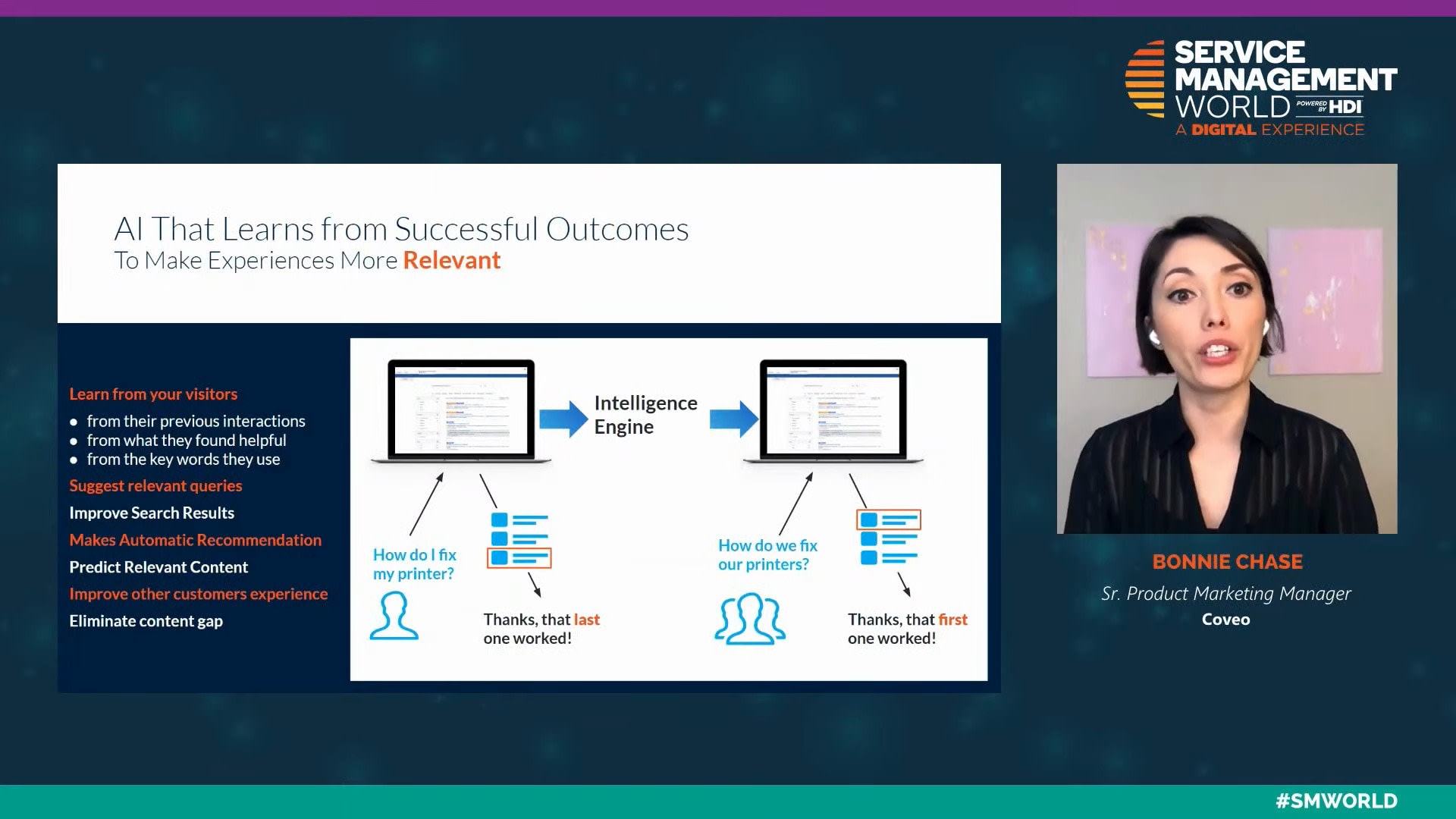Hello, everyone. Thank you so much for joining us today. My name is Bonnie, and I'm on the product marketing team at Coveo. And I'm joined today by my colleague, Juanita. And today, we're here to talk to you about how digital leaders are transforming customer and employee experiences with AI. Now over the last few months, there's been a shift in the perspective of the employee experience and where that sits against the customer experience. And from our perspective, it doesn't have to be either or. It can be both. And so we'll talk to you more about that today. Thanks, Bonnie. And hi, everyone. Really excited to be here to talk to you and give you a perspective on how to balance these two very important areas, at every company. So, of course, there are many new normals that we're experiencing throughout this year, but the new normal that Bonnie alluded to is the fact that companies now need to be agile as it relates to developing their customer and employee experience. And at the beginning of this year, every company was sort of awakened as to where their investments were being driven because of the pandemic that we're all experiencing. And so today every company knows that they really need to be agile and to take both experiences into serious consideration. So put simply, if at the beginning of this year, you had put a little bit more priority and a little bit more investment on the customer experience side of things, the pandemic was really sort of an away an awakening to many companies and leaders, and it really highlighted the importance of putting the right priorities as well as the right investments in the digital workplace. And so, you know, customer experience is no longer more important than employee experience. They're really both, they really both serve the same purpose and they go hand in hand. And what we saw play out this year were a couple of different sides of the spectrum. Since billions of people were were ordered to work from home earlier this year, we saw those companies that were absolutely prepared to shift to remote work, and then we saw others that necessarily worked. So on one side of this spectrum, we saw companies and employees that had never worked from home before. And so there was a little bit of scramble to get employees set up properly to get the right connectivity, VPN, secure access to the digital workplace. And on the other side of the spectrum, there were companies that had been investing in digital workplace areas over time and for many years. And for those companies who had made steady investments over time, business did not skip a beat for them. And the real difference between, these two sides of the spectrum were those companies that were conscious of the impact that investing in your employees, had on the actual customer experience as well. And so we truly believe that there really is a center of balance and with today's advanced technologies including things like AI, companies can really achieve being able to deliver both a great customer experience and an employee experience. And the reality is that both of these key stakeholders expect that companies give them a great experience because they've been a bit spoiled by the giants of enterprise such as Netflix, Amazon, Google and even Facebook. It's really the consumerization of IT that has driven employees and customers and they're oftentimes one and the same to expect these great experiences. So we believe there's many parallels when it comes to employees and customers, and one of these parallels and similarities is actually, some of the same pains that both stakeholders are experiencing. So as you can see here, IT teams spend up to eighty percent of their time maintaining legacy technologies. And that leaves just twenty percent of their time to be able to develop new solution for internal and external customers. And so if both, both customers and employees are experiencing the same pain points, then really there is a sort of root cause that really can be addressed here. And it's really the technology, in the right sets of smart technologies that can be used to make sure that you're controlling and managing your stakeholders experiences, wherever they're interacting with you and at every moment that they are, looking for information from you online. And so what we see this pain point, this common pain point, impacting is it's really creating this level of dissatisfaction and frustration among employees and customers. So on the employee side, the left hand side here, you know, workers are saying that they're underutilized, they're uninformed, and they spend nearly one month each year just searching for information, searching for knowledge, and searching for expertise. And Bonnie, you might wanna comment on the customer side of the house a little bit. Yeah. Absolutely. And so, you know, we we see similar things on the customer side, and we know that more than half of customers who have a poor experience are are willing to leave a company for that. And this really directly impacts the bottom line because what ends up happening is you're not really competing over the product anymore. It's the product and the experience, and both your employees and your customers expect better. Absolutely. And as I mentioned before, with this whole consumerization I of IT, employees know employees and customers know you can do better. And so if for any reason you're still sort of wondering why this, experience matters, we wanted to put forward a few a few very interesting stats again, both on the employee and the customer side. So on the employee side, really employees are a company's most important asset. If you have the right talent, that really can give you a competitive advantage. And what we see here is that EX leaders or employee experience leaders have forty percent less employee turnover than their competitors. And another interesting stat here is that EX leaders also beat out the average SMP by a hundred and t