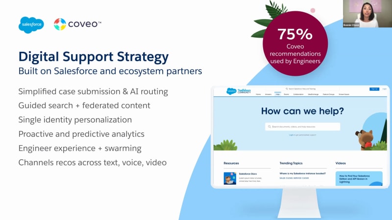 Alright. I think it's time for us to get started. Hello, everyone. Thank you so much for joining our webinar today, scaling relevant support at Salesforce. My name is Bonnie, and I'm director of product marketing here at Coveo. And I'm also thrilled to be joined by our speaker, Madhav Tuttai, who is VP of strategy and operations at Salesforce. I have a couple of quick housekeeping items to cover before we get started. First, everyone is in listen only mode. However, we do want to hear from you during today's presentation. We'll be answering questions at the end of this session, so feel free to send those along using the q and a section on your screen. This webinar is being recorded, and you will receive the recording after the presentation. Now I'm excited to get started, and the topic today is really around scaling relevant support. We've all been facing the challenge of keeping up with the rising and changing expectations of customers, and it's really valuable to learn how leading brands like Salesforce are able to keep up with these imperatives. And in a company of that size, it's important to create a strategy that is not only digital, but is scalable and relevant to each customer. So Madhav has joined us today to share how, they at Salesforce approach creating a digital support strategy. So to kick us off, Madhav, why don't you tell us a little bit about yourself and your team at Salesforce? Thank you, Bonnie. Really excited to be here, and look forward to the discussion. So I've been at Salesforce about a year now. Did a variety of things before, including some time at, Google, startups, and, and other places. My role at Salesforce is really to manage, our strategy and operations team for our global support, organization, and that really means two things. It means, one, my team manages all of our central operations, so things like capacity planning, strategic and financial planning, readiness activities for product launches, things like that. And then I also have a team that is focused specifically on experience improvement at each part of the journey. And and today, we'll talk about some of what that is in conjunction with the big, digital transformation that we're undergoing right now. But I have teams that work on how do we improve the experience, how do we improve our processes, how do we leverage the best technology to really get the best experience both for our external customers, but also for our, internal engineers. So it's a really, really fun, it's a really fun role, and we and we spend a lot of time at the intersection of technology, experience design, and really driving, the best outcomes for our stakeholders. Yeah. That's great. And you have a huge footprint. Can you can you cover a little bit about that? Yeah. Absolutely. So the team is well over three thousand people, globally. We have a few specific hub locations around the world as well where we have concentrations, of folks. We are a single global support organization for all of Salesforce's products, across all of the regions, across all of our customer segments. And so we really run this organization at scale to support every Salesforce customer. We, of course, handle cases both in the human assistant side where you can see we have, you know, over a million cases that we handle a year. And then self-service, which we'll talk about a little bit today, self-service and our digital, digital platforms are a huge source of engagement for us, whether that is our help website, our community forums, Trailhead, many of the other wholesale digital resources that we have. That is a place where customers gather and make sure that they're actually getting the questions that they want, answered. And so that's our that's our support organization, large, and at scale supporting, you know, the hundreds of thousands of Salesforce customers globally. Yeah. And so when we think about the strategy for that self-service experience, you know, can you walk us through the approach at at building that at scale? Because, you know, you you you're all over the globe, millions of interactions, a variety of different types of users. So how do you make sure that you're you're really able to do that well? Yeah. So this was really the key question as we thought about our digital transformation to begin with. And as many folks know and probably many on this call, deciding to embark on this journey of transformation is not easy. Right? We really have to have the right structure behind it, the right investment behind it, the right imperative and executive support to really drive it forward. But as we looked at our overall experience, it was pretty clear to us that there were many, many things about the experience that we felt were inefficient, that we felt were, not making things easy for our customers to really get access to the right content that they needed, get access to the right people that they needed. Similarly, on our support engineer experience, there was a lot of friction involved, a lot of outdated tools, a lot of compromises that we were making in order to deliver on this experience. And so we really thought about this holistically and said, okay. Do we really wanna go, rip the Band Aid and really reframe this experience from scratch, across every single stage of the journey for all of our personas? And that's obviously a big undertaking. Now we decided that we were gonna do that, and then, of course, we hit the pandemic, which, of course, accelerated a lot of things in terms of customer behavior, in terms of our ability to work from anywhere. And so taking all that together and driving this transformation has been an incredible effort. It really started with what you see here on this, on this slide, which is we first really needed to understand the journey. Who are our customers? What are their actual personas? What do they care about? What do they need? What are the jobs to be done? What is the kind of experience they want at every s
