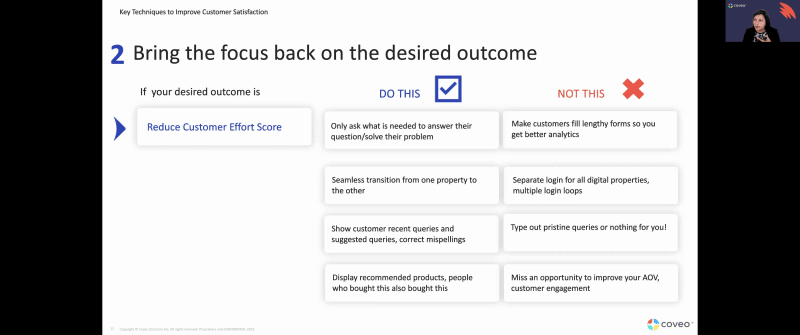 Good afternoon, folks. I hope everyone's doing well. Thank you everyone for joining. We will sit tight for a few more minutes just to allow everyone to keep, coming in, and then we'll, be on our way. Think we can get started, Thomas. Excellent. Thank you everyone for joining us today. It is quite a pleasure to be with you together this afternoon. We have an awesome webinar for everyone here on the line. My name is Thomas Kowiak. I work with our strategic clients at Coveo, working with them whatever use case they they they have and they leverage us for, to ensure that they see value in their partnership. I'm joined today by the awesome Lipika Rama, and, she is gonna be leading this presentation today. I'm gonna be taking on the role of moderator for today. So I will be sending in some polls. I do encourage everyone to participate and, send us your comments. We will record today's session. You will be able to receive a link for that recording afterwards. And, please do not hesitate at any time, in the presentation to either submit your questions in the chat or to raise your hand. We absolutely love, the, forum environment that we can create. So without further ado, I'm gonna turn over to Lipika for today's presentation. K. Thank you, Thomas. And welcome everybody. And, in today's webinar, we're going to talk about U. S. Best practices that drive customer satisfaction. This is part two of our, you know, U. S. Best practices webinar. So we did one earlier this month. If you haven't watched that, go back and watch the recording because we're gonna, you know, go over some of the concepts that we talked about in our first webinar as well. I'm Lipika Brahma. I'm a customer success architect at Coveo. I work in the customer success team. Thomas and I are on the same team. I provide additional technical guidance to customers to make sure that they reach their desired outcome quicker. So let's get started. So in today's webinar, the first things first, we'll do a very quick level set on what is CX, what is UX, what is UI because we'll be using these jargons repetitively and sometimes all over the place. So it's let's make sure we all know what all of this is about. We're gonna geek out a little bit on the stages of UX maturity. And, you know, we'll we'll try and understand where you are at at in terms of UX maturity within your organization. And that's the goal of this really. We look at some industry trends, and, you know, I've peppered in some industry trends throughout the presentation so we can look at, know, what is the industry saying and why should we be doing, what we're doing here right now. We look at some key UX techniques that drive customer satisfaction. Now when I say key UX techniques, we're gonna look at techniques that we have seen our customers employ and get to their business outcomes really, really quickly and really, really fast. So because if we start talking about US techniques, there's there's so many different things you can do. But we are trying to boil it down to if you have a Coveo implementation, these are things we have seen customers do and succeed. So let's focus on that today. And then we'll do a quick recap of everything that we have covered. So first comes first, let's get clear in all of our heads about the jargons. The UI is the user interface. So anything that you're interacting with. If it's a website, it is the search box. It is the facets. It is the filters that you can interact with on the website. So the visual elements of of what you're interacting with. The user experience is the interaction that you're having with it, whether you're going to find something, whether you're going to log a case, whether you're gonna purchase a product, all of that. The c x is the totality of UI and UX. So it's everything that comes from a visual interaction to what is happening in the back end. You have knowledge management processes in the back end that are supporting what you're doing in the front end. All of that is your CX. Now let's look at the stages of UX maturity. Right? I think it is important for you to understand what should be your next step, where you're at. So the this the the fact that you're on this webinar, you're wanting to know more about UX, you're not in stage one. You're you're good. You're not in stage one at all. It's not absent. So there are people in your organization that are thinking about UX, so you're not on stage one at all. Stage two is when you have, you know, limited focus on UX. So this can happen, you know, you're doing UX sometimes only for compliance reasons or for legal reasons. So for example, if you have a website that has to be accessible to make sure you reach different types of audiences and all of your customer base, that could be an example of it. So you're you're somewhat doing it, but you're not necessarily doing it all over your teams. There's no culture yet. If you are in this stage, what you need to do to get to the next stage is to focus on getting people to listen to what UX is, and how how it can help you. The next stage is the emergent stage. This can happen when you have smaller teams that are, that are, you know, focused on UI UX. You might have a leader that has done UX before and is very excited about it and is there to support you. But you still might not have it across all of your teams. So you might have it only in your support organization, but nobody's really thinking of it in your product. So that's where the emergent stage is. And if you are in that stage where it is there, but it's not consistently there across your organization, then you do for then you need to focus on building a culture around UX. Then comes structure. Now this is where most organizations are according to what, you know, the Nielsen group says. Most organization remain in the structure phase where they have different teams that are focused on UX. Every team has, you know, some capabilities where they are thinking about the desired outcom