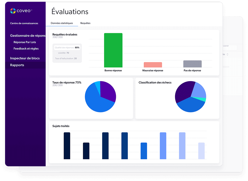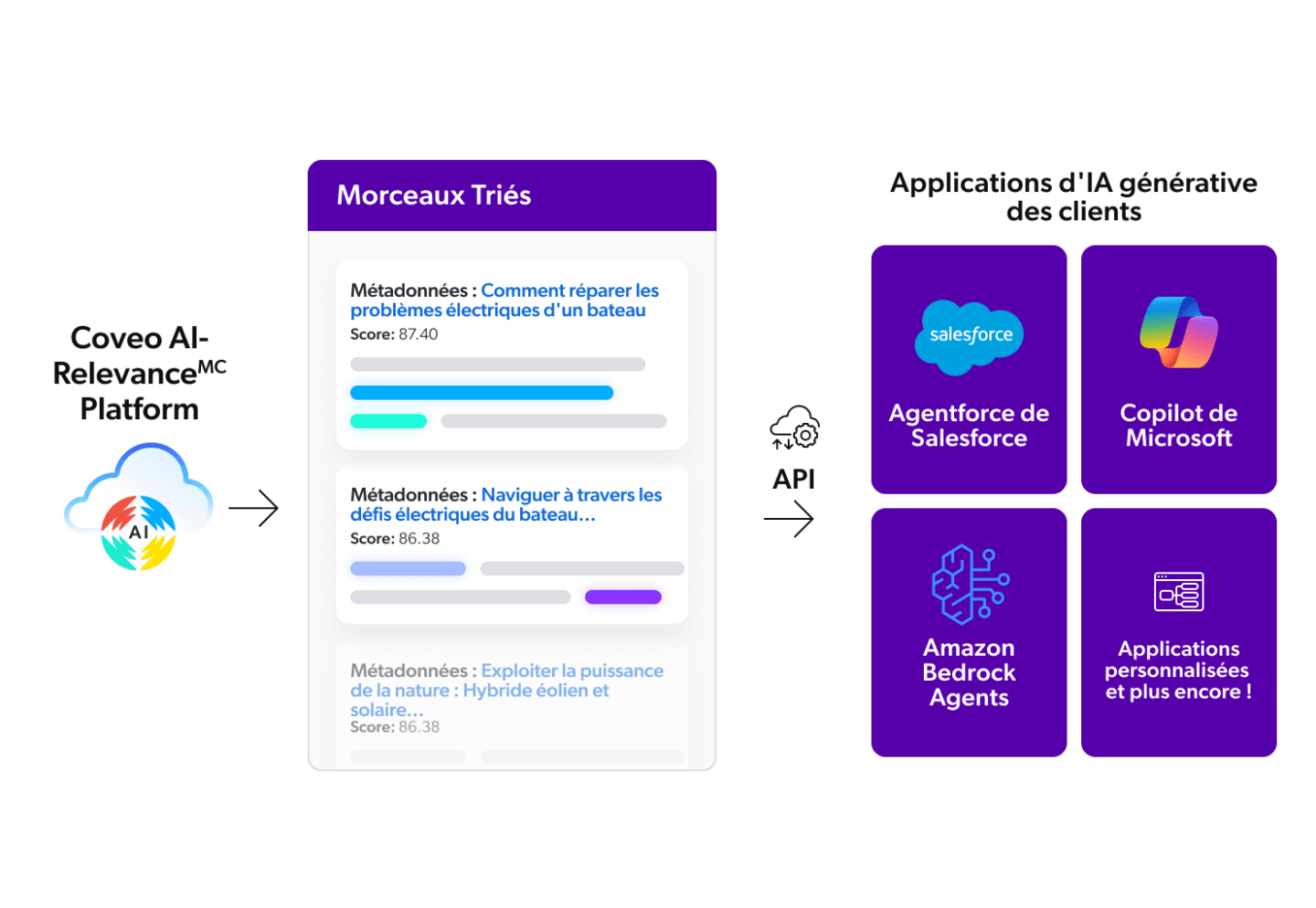 - RAG (Retrieval-Augmented Generation) prêt pour l'entreprise :Coveo unifie les données de l'entreprise et alimente vos applications génératives uniquement avec de l'information fiable et pertinente. Le résultat : des réponses fondées sur les connaissances de l'entreprise, précises, sécurisées et adaptées au contexte.