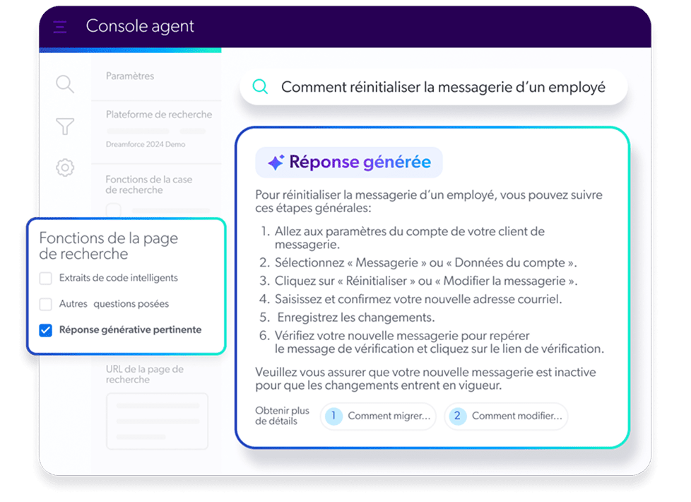 - Réponse générative prête à l'emploi : Coveo Relevance Generative Answering (CRGA) fournit des réponses génératives entièrement gérées, fondées sur la pertinence de l'IA de Coveo, leader dans l'industrie, et sur une recherche de niveau entreprise.