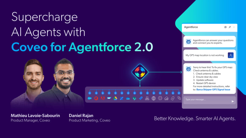 Lorsque les connaissances se trouvent au-delà de Salesforce (SharePoint, Confluence, GDrive, LMS, etc.) - Coveo les unifie via 30+ connecteurs OOTB sans migration.