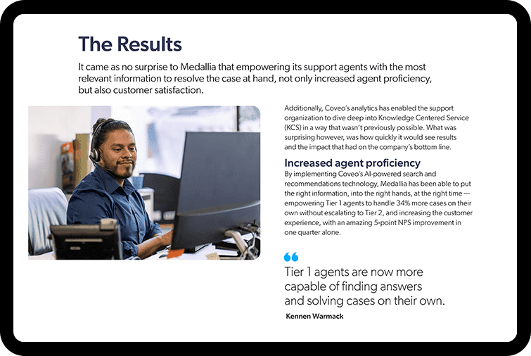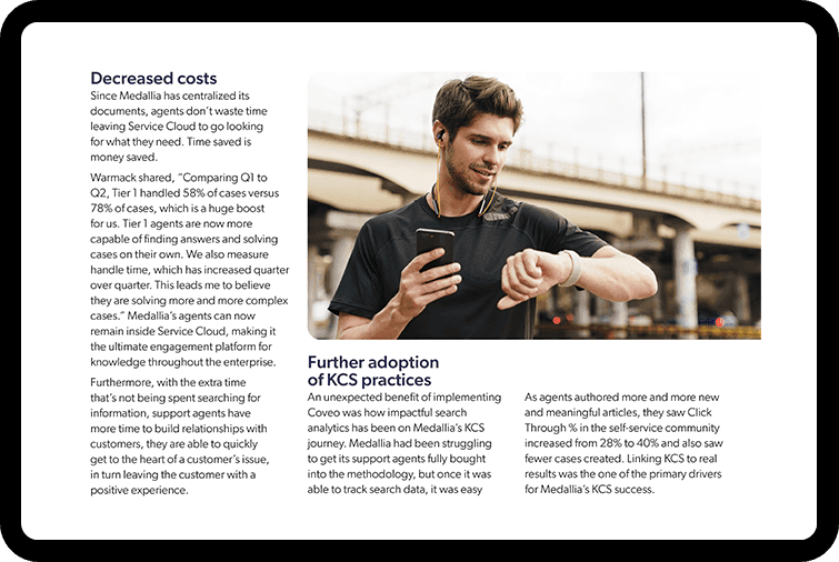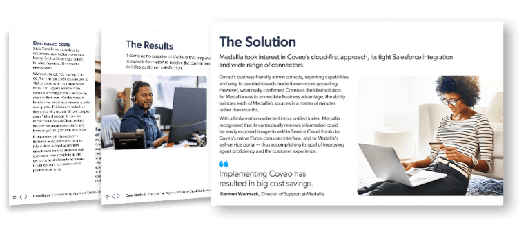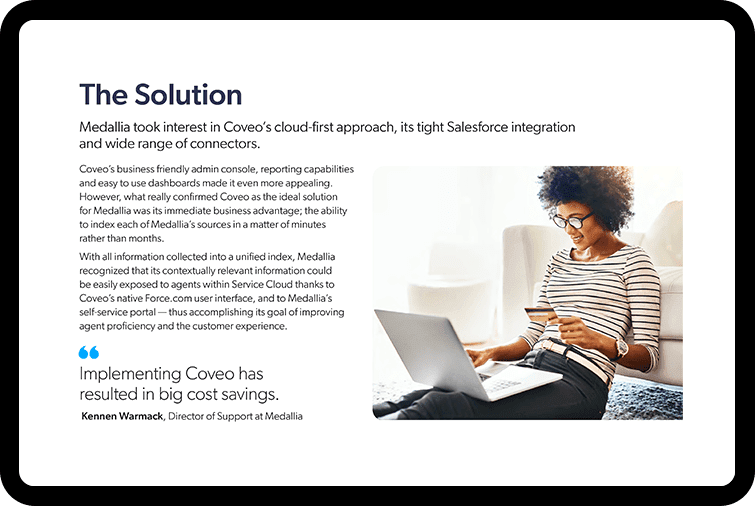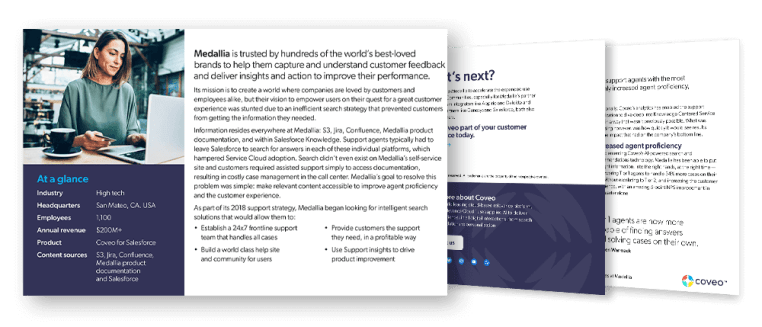 Medallia’s transition from several disparate knowledge bases to a single, unified support hub solves satisfaction issues from both inside and outside of the company. Agents can do all their searches from within the Service Cloud, seeing the most relevant and updated support resources listed first.