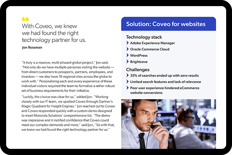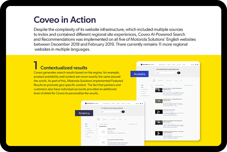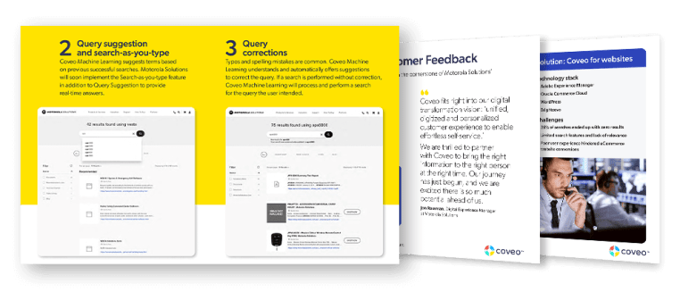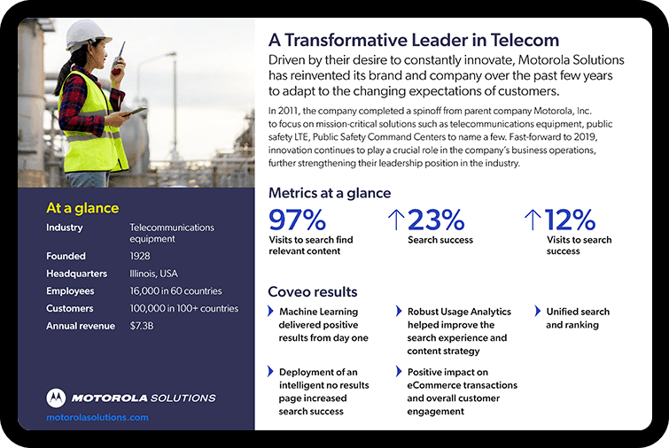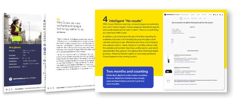 By partnering with Coveo for unified search and ranking powered by artificial intelligence and machine learning, Motorola Systems saw positive search improvements from day one. Ecommerce transactions increased, customer engagement improved, and content strategy became more responsive to real-time visitor needs. Motorola Systems can look to the future knowing that improved digital customer engagement is truly possible.