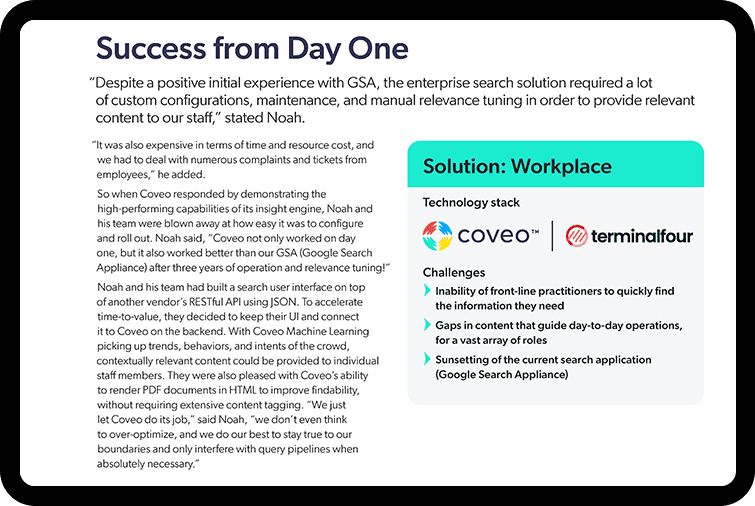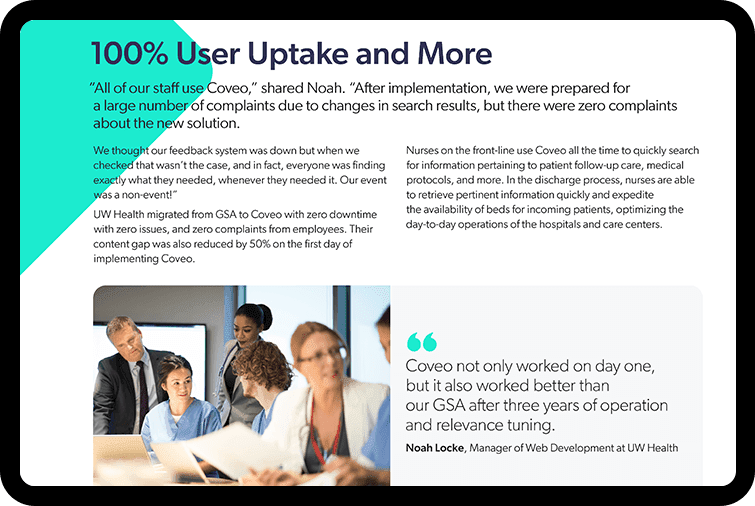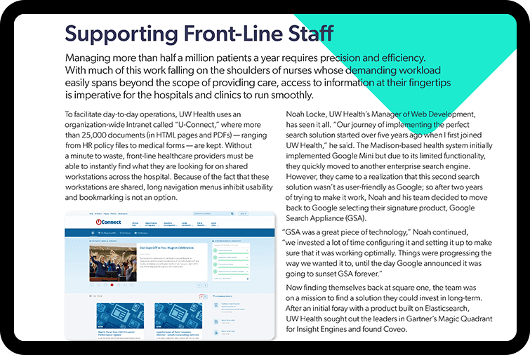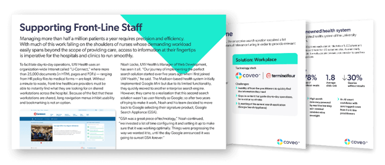 Managing over half a million patients requires copious amounts of information and paperwork. To maintain precision and efficiency, UW Health teamed up with Coveo to deliver powerful intranet search. Healthcare teams now have the information right at their fingertips.