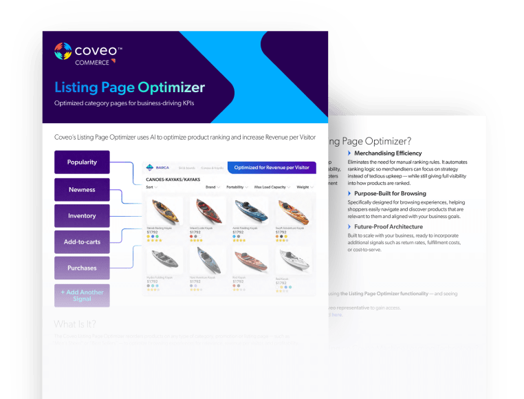 Ce que c'est. Apprenez comment le Listing Page Optimizer de Coveo utilise l'apprentissage automatique pour analyser les signaux comportementaux, les attributs du catalogue et les variables calculées - classant intelligemment chaque produit pour s'aligner avec vos objectifs d'affaires.
