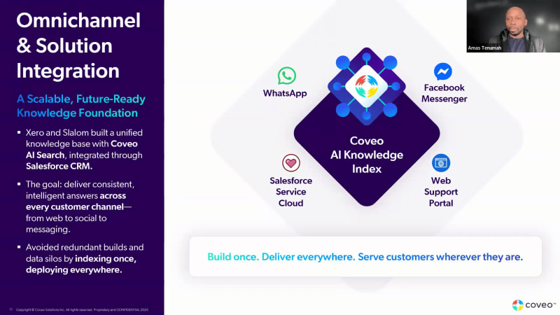 Welcome, everyone. Before we get started, a quick note on format. Today's session is in a simulive format, which means the presentation is prerecorded. But our panelists are here live in the chat to hear to answer your questions, during our q and a portion. While we won't be responding through audio during this session, if you have questions at any point, just drop them in the q and a, and we'll answer them as we go. So with that said, thank you for joining us today for our session. We're gonna go inside Xero's next generation support experience. We're gonna walk through how Xero transformed customer support using Generative AI inside Salesforce to deliver faster resolution, reduce inbound, and strengthen customer loyalty. This is a real story of transformation. It's not a concept demo. It's not a future state vision. We're gonna show you why Xero shifted to Gen AI, how Xero, Coveo, and Slalom together designed the solution, and what changed for Xero both operationally and culturally along the way. We're also gonna showcase the measurable business outcomes that followed, and they're non negligible. Our goal is really to give you practical takeaways that you can use in your own organization. And to help us do that, we have Nigel Piper, the executive GM for customer experience at Xero, and Amaz Thesaurus, the service cloud transformation leader at Slalom. Before we hear from them, first, we're gonna dig into who Coveo, Slalom, and Xero are. So let's start with Coveo. At Coveo, we help enterprises bring AI and search together to deliver relevant, trusted answers across every experience, service, commerce, workplace. Our platform unifies content wherever it lives and applies AI to return the right answer in the right context with governance and security grounded and in place. Everything is powered by our unified relevance engine, which combines search, recommendation, and Geniei grounded in verified enterprise content. This really matters because accuracy and trust are essential when deploying GenAI, especially in a service context. At Coveo, we're proud to support over seven hundred global organizations like Xero with our single AI relevance platform and with over eight hundred applied AI experts based on over fifteen years of search and AI relevance innovation. In today's example, you'll see how Xero leveraged visionary leadership and joined forces with a strategic partner in Slalom to leverage the Coveo powered trusted relevance layer and enable safe and impactful AI adoption inside Salesforce at scale. So let's turn now to Amaz Denyema to talk to us about the slalom approach and later on how they help bring Xero's vision to life. Amaz? Thanks, Alex. I'm happy to be here. Looking forward to this conversation. So, at Slalom, we approach this thinking about the humans first and foremost. So our approach starts with why, and then we go to how. And our why is always the humans that we're impacting with these solutions we're designing or implementing. So, in many cases, it's an external clients and customers, but in most cases, it's both. It's an external customer, and it's also, an internal, employee. In this case, those who drive, service and support for, for Xero. We do this by through our partnership. So we have partnerships with great organizations like Coveo and Salesforce, and then we myopically focus on what the outcomes our partners are trying to accomplish. And then we bring all of those things together because we understand the transformation is not just about technology. It's about people. It's about processes. It's about strategy. And our role is just coordinating and making all of this work together. We we we we then organize their service model, change readiness so that as we then implement this, technology, we we go about answering this one very important question, which is what does success look like for the humans, in this case, customers, and in this case, your employees. And for Xero, in this example, we're gonna be talking about, which I'm excited to dive into, it's about how could they scale service and support without sacrificing what made zero what they are, which is this authentic human based support. That's where our in this case, we brought out design, our governance, and our ability to fuse this partnership together to help them get to that outcome. So that's, our part in this journey. Looking forward to delve in deeper into it. Thank you. And before we move into the solution, we'd like to talk to you a little bit about the organization that regroups the humans that, Amas and Slalom designed the solution for, just to ground the conversation on who Xero is. They were founded in two thousand six. They've grown into a global accounting platform trusted by more than four and a half million subscribers and growing. The platform is built for small businesses and the advisers who support those small businesses. They bring accounting, payroll, payments, and reporting together in one place while also connecting to over a thousand apps that create a flexible and scalable ecosystem. With that context, I'm going to hand things over to Nigel, to maybe elaborate a little more and, most importantly, share the story of how Xero evolved its customer experience. Thanks, Alex. It's great to be here. It's it's been a a really interesting journey, and and thanks for the reflection of of the numbers. What what's the interesting, part that might give context to to the viewers is is I joined Xero thirteen years ago now. We had a hundred thousand customers at the time, but we had a vision to certainly grow exponentially. And and, obviously, we report today that four point five million customers. But, really, the challenge that I had all of that time ago is how do we how do we grow, support our customers with world class experiences, but how do we do that in a in a pretty meaningful way? The the choices around whether it was content, whether it was technology, whether it was people. How do y